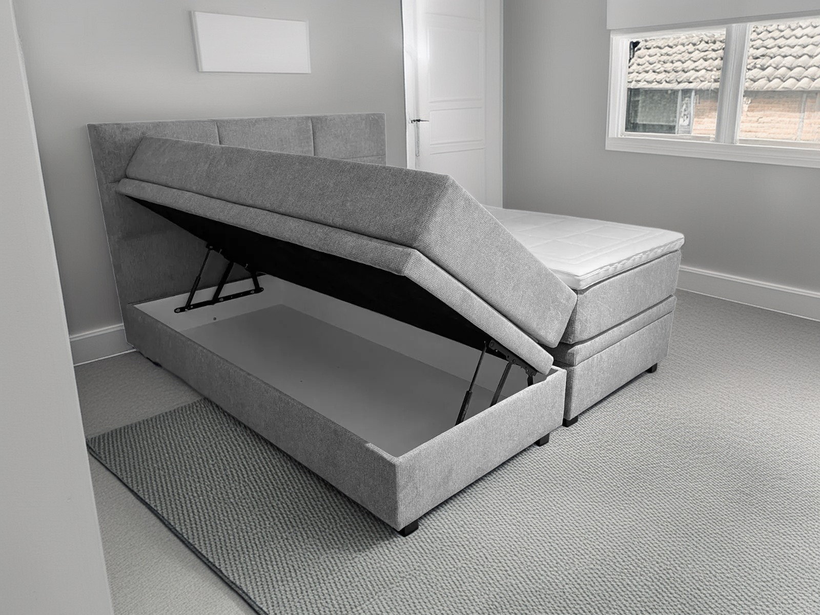 Ontdek de luxe boxspring Storage, waar comfort en functionaliteit samenkomen. Dankzij de handige opbergruimte onder het bed geniet je van extra plaats zonder in te boeten aan stijl. De meegestoffeerde pocketverenmatrassen in dezelfde stof als de boxspring zorgen voor een harmonieuze uitstraling, terwijl de 6 cm dikke koudschuimtopper extra comfort en optimale ventilatie biedt voor een zalige nachtrust. Verkrijgbaar in diverse afmetingen — 90 cm, 140 cm, 160 cm en 180 cm.