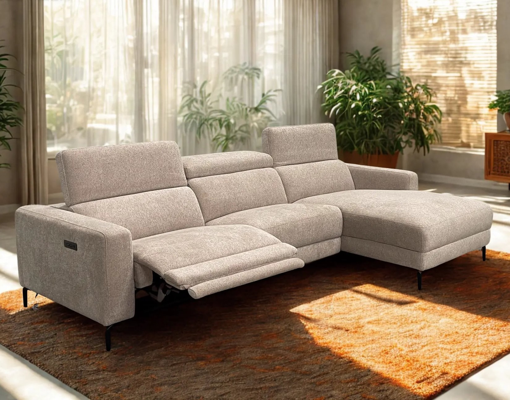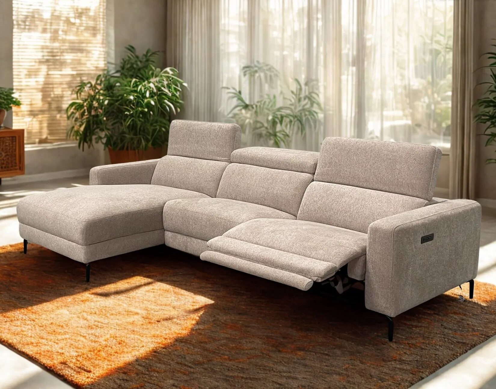 De salon Maggie met longchair is uitgevoerd in een mooie, trendy stof en vormt een perfecte combinatie van stijl en comfort. Dankzij de verstelbare hoofdsteunen geniet je van een ergonomische zithouding, terwijl de elektrische relaxfunctie zorgt voor ultieme ontspanning na een lange dag. Een eigentijdse salon die comfort en design moeiteloos samenbrengt.