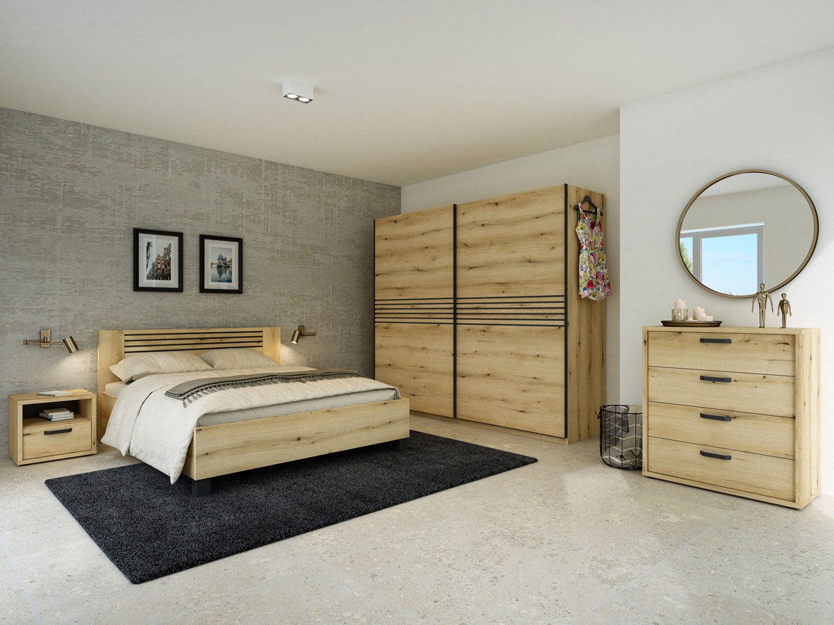 Deze stijlvolle slaapkamerkast met plaatsbesparende schuifdeuren is de ideale oplossing voor wie functionaliteit en design wil combineren. Verkrijgbaar in breedtes van 1m50, 2m en 2m50, past deze kleerkast perfect in zowel compacte als ruime slaapkamers. De schuifdeuren zijn uitgerust met een geïntegreerd remsysteem, waardoor ze zacht en geruisloos sluiten voor extra comfort en gebruiksgemak. Het bed bestaat in breedtes van 1m40, 1m60 of 1m80. Kom deze slaapkamer van Belgisch fabrikaat ontdekken in onze ruime toonzaal.